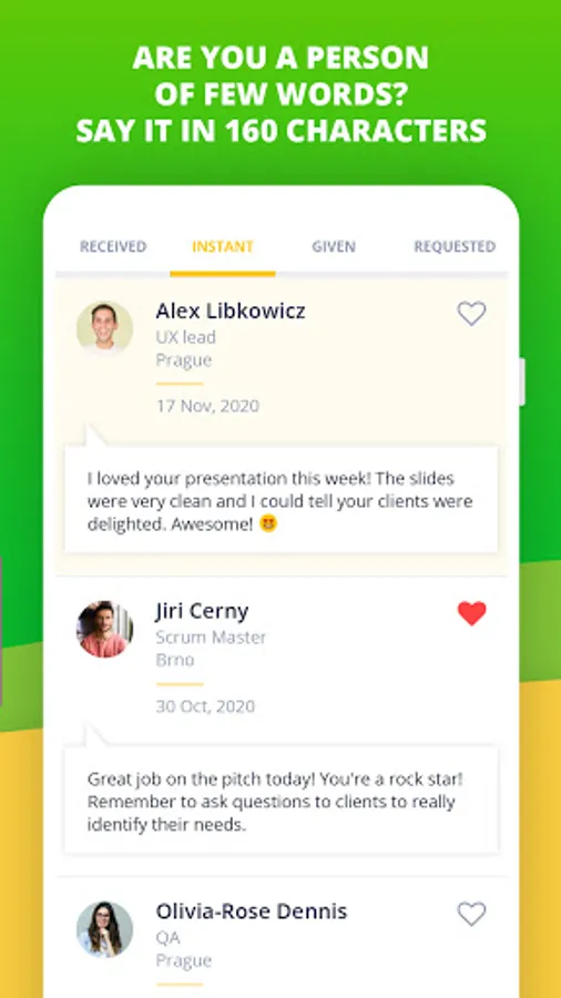 Did you see excellent work from a colleague? Tell them! With Instant Feedback, you can share your thoughts in 160 characters. It's a quick and easy way to recognize your colleagues or let them know what to improve on.