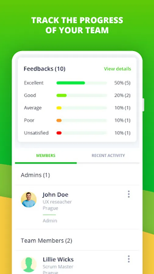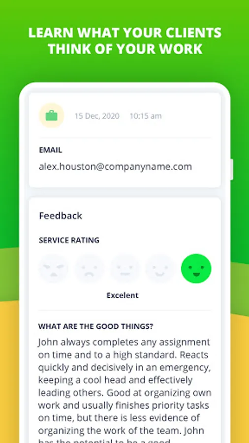 Client is king, and with WeGrow you can request feedback from internal clients (other employees in the organization) or external clients (outside the organization). Just enter the name or email for the person, and the person will receive an email, they can give feedback from their browser and you'll receive it in WeGrow. No need to install any software. Client feedback can be at the individual or team level.
