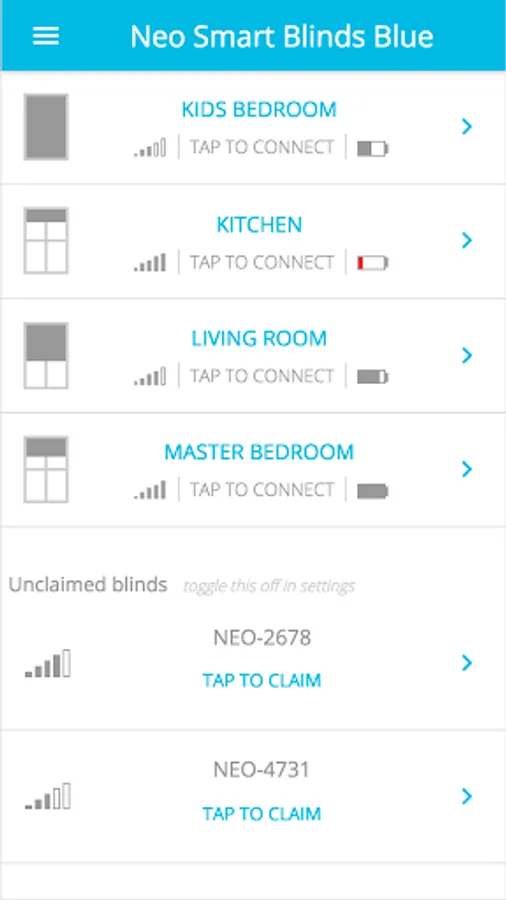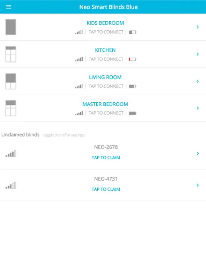 This app provides Bluetooth control of any motorized blind, shade or window covering built using a Neo Smart Blinds Blue Motor. Features include control of individual units and schedules.