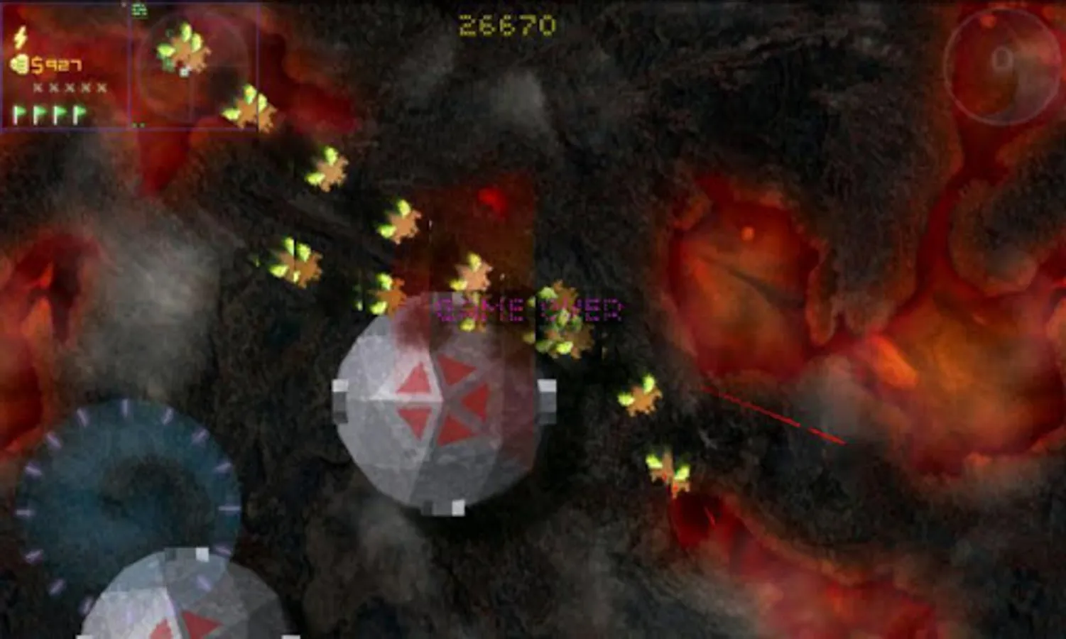 As you progress through the waves, you're going to need those upgrades as more deadly enemies are introduced. Old-school afficanados will recognise some of the aliens based closly on arcade (take a look at the Pods/Swarmers!). Upgrades available include R-Type style extra laser pods to double or triple your firepower, ECM attacks (aka Smart bombs), turrets for multi-touch 360 degree shooting, and more.