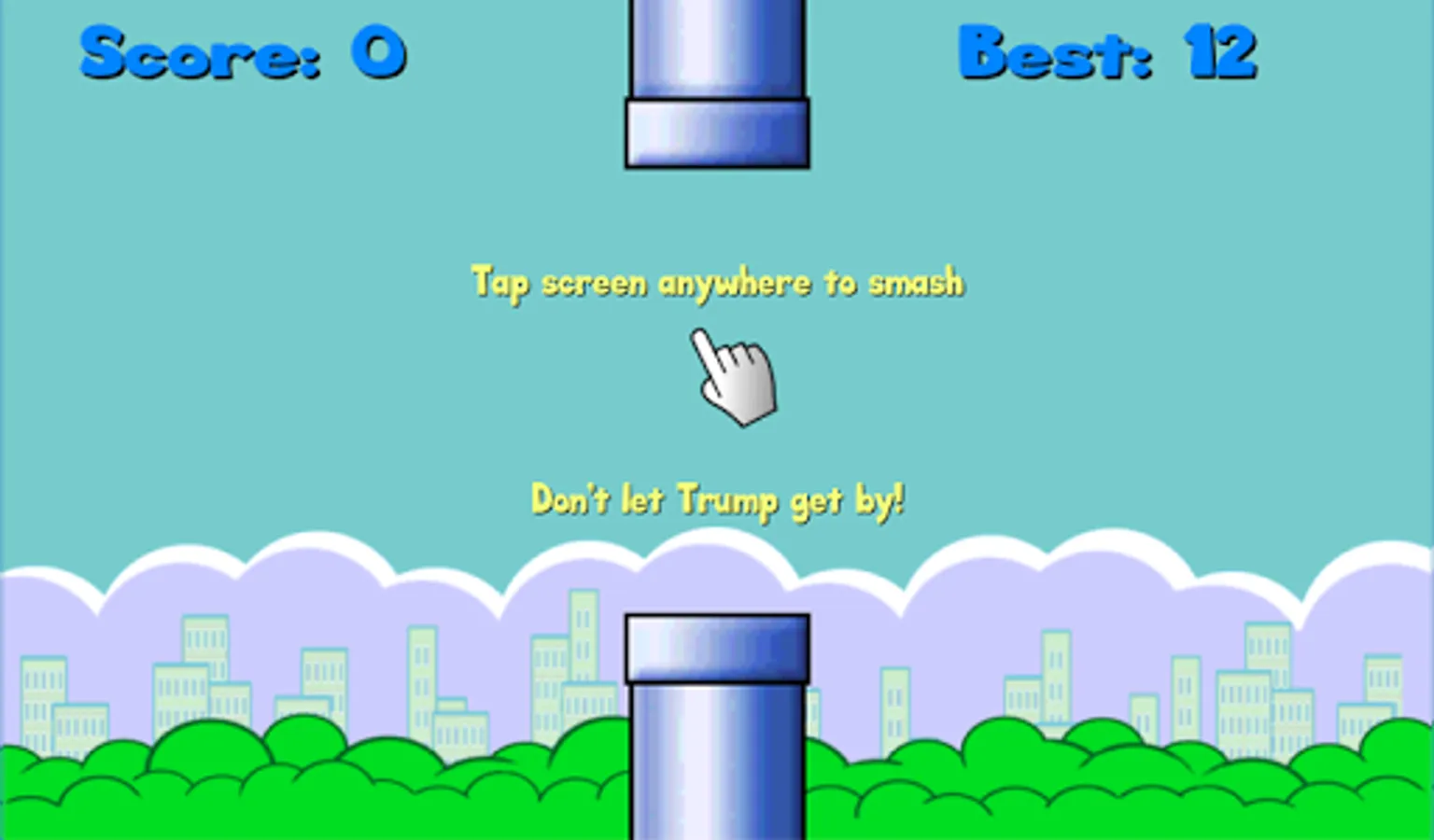 Welcome to Stop Trump. The satirical game that promises everything and delivers nothing more than a satisfying opportunity to splat that stupid orange faced Donald Trump with a deft prod of your middle finger.