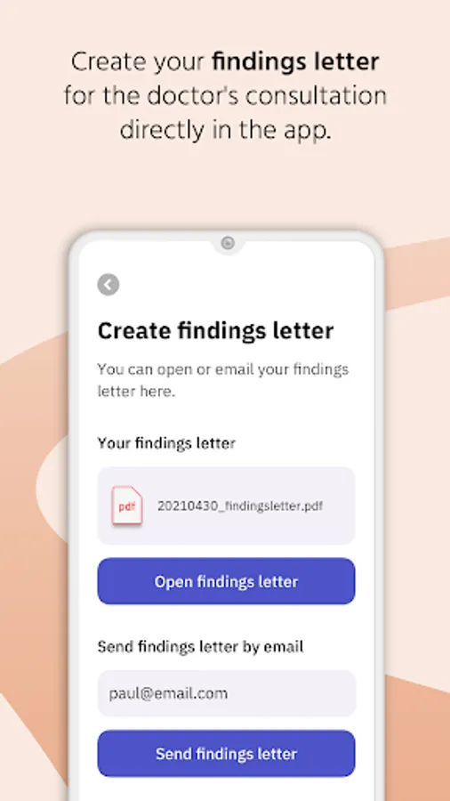 - Create a report directly in the app to evaluate the results for the physician's consultation