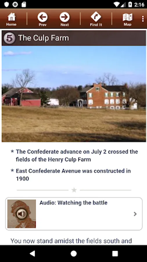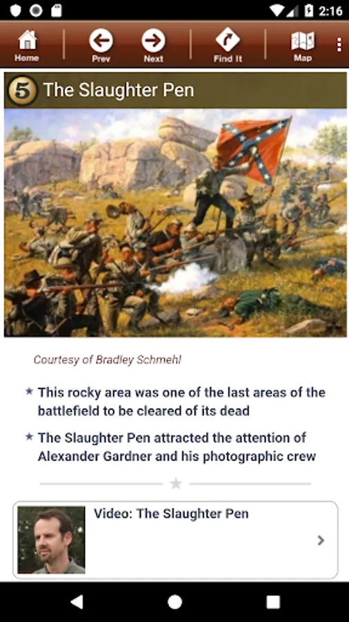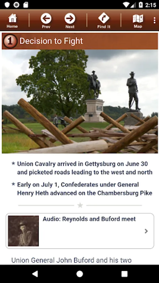 Click on our "virtual signs" to access a wealth of information related to the very location where you are standing. Onboard historian videos, audio accounts from soldiers and civilians, photos, facts, and more are just a click away. Never has so much information been made available in such a portable device!
