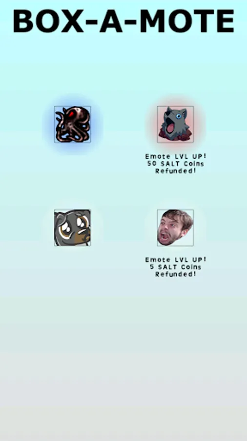 Collect all of the Emotes! Just do it! There's a lot of them and they come from all kinds of funny people including eggs, gold people, and even living memes. Box-A-Mote is meant to be satirical and contains references that the general audience may not understand.