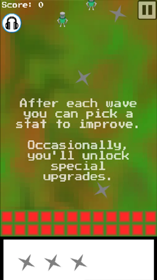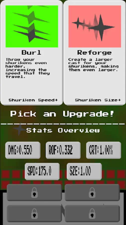 In CFSD, players are tasked with defending a village from an endless robot hoard by flinging their shurikens at the oncoming invaders. Between waves, players are offered a choice between two stat upgrades. Periodically, the player will be given the choice of two permanent upgrades that can change the way their shurikens behave and also gives the player another stat to upgrade between waves.
