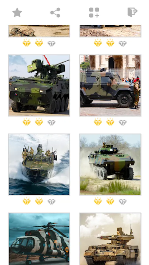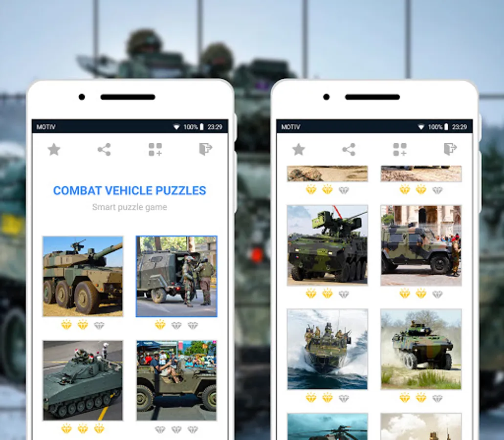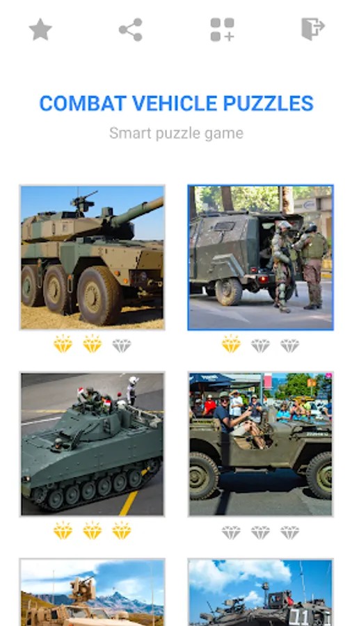 People all over the world love to collect jigsaw puzzles because it is a rewarding activity. Puzzles or, as they are also called, mosaics are a very useful and interesting hobby that develops a person. Puzzles help develop memory, imagination, strategic thinking, attention, and improve analytical skills. We have selected a collection of pictures with different types of combat and military vehicles to make it more interesting for you to play and collect jigsaw puzzles. Each technique picture in this app is divided into 25 segments. You have to put together a picture by moving the desired segments to an empty space. This is very exciting because every time you can improve your performance, improving your skills. Our puzzle game is suitable for all age groups.