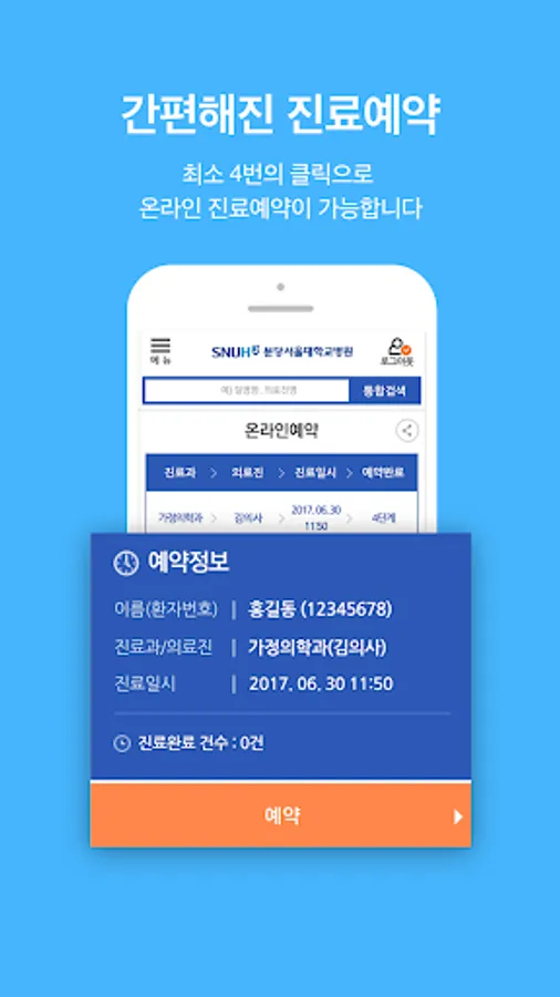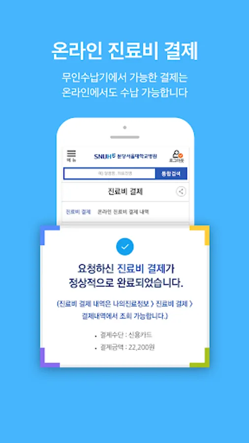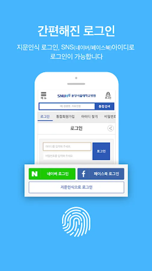Sign in with Naver and Facebook, as well as was possible even fingerprint login, you can schedule a call with a much simplified process than ever before. You can also pay medical expenses were the most possible in mobile applications and PC, subscribe to a variety of health and fun content from Seoul National University Bundang Hospital.