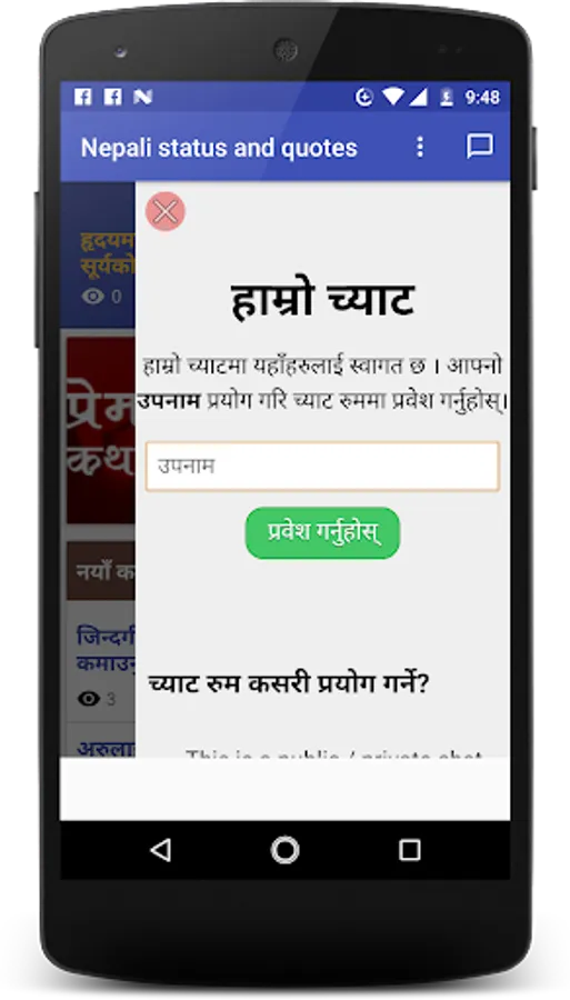 Nepali Status and Quotes 2020 app presents you with nepali status and quotes. The app consists of following quotes and statuses.