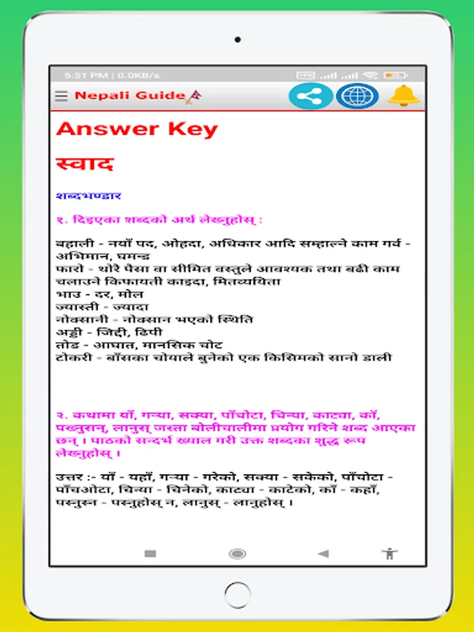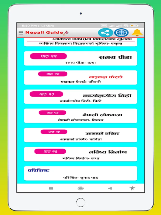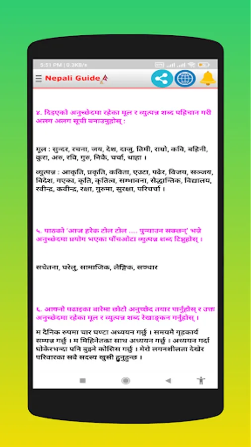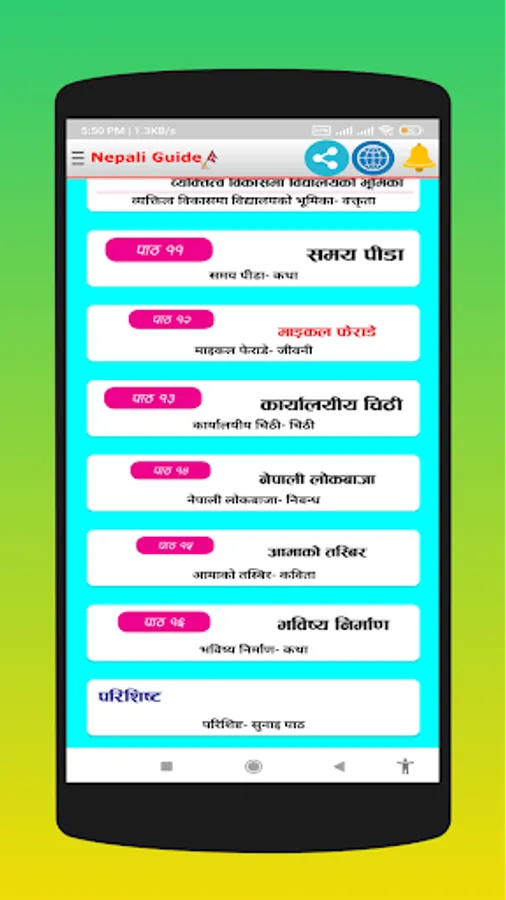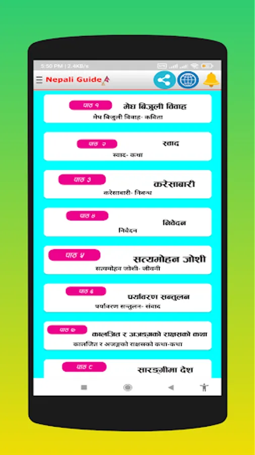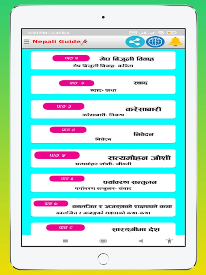 Class 9 Nepali Guide Book is the best solution app for Nepali books. It is an easy-to-use educational application. This application contains a complete solution to all chapters of class 9 Nepali Subject. Now Prepare class 9 Nepali from mobile very easily because this application help to learn and read about the class nine guide books. Now enjoy Class 9 Nepali Guide on your android phone or in your tablet with a complete solution with a full book.