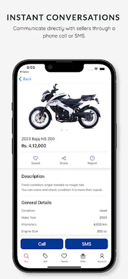 4. Instant Connections, Real Conversations: Communicate directly with sellers through a phone call or SMS. Discuss details, negotiate prices, and schedule test rides - all in real-time!