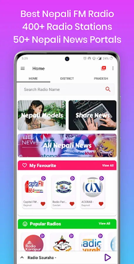 Download All Nepali FM Radio Station app and enjoy best radio streaming app in Nepal with Record, Sleep Timer and 50+ Nepali News Portals.. You can listen FM radio from all over Nepal. You can listen all Nepali local FM radio stations from different District and Pradesh, whether you are in Nepal or aboard. You can get stock market news and Nepali Models Wallpaperas well from the app.