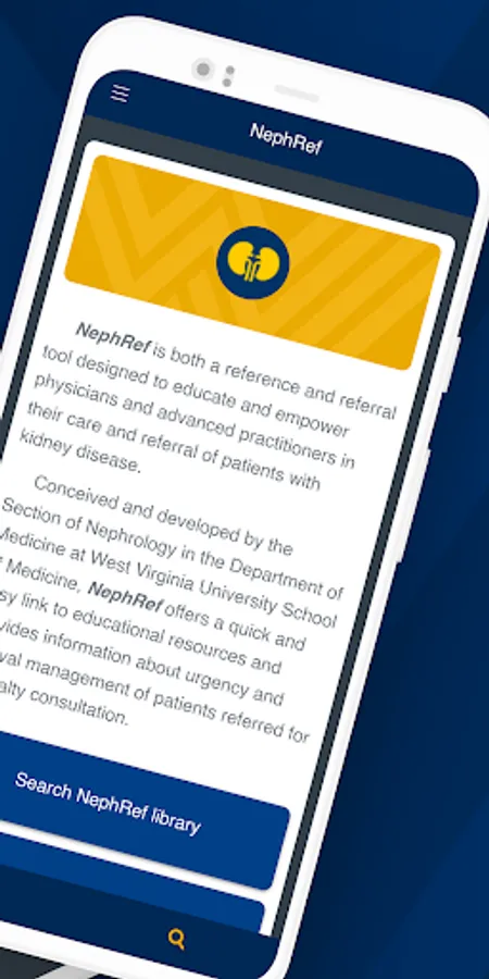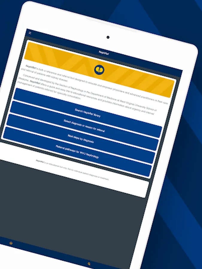 Conceived and developed by the Section of Nephrology in the Department of Medicine at West Virginia University School of Medicine, NephRef offers a quick and easy link to educational resources and provides information about urgency and interval management of patients referred for specialty consultation.