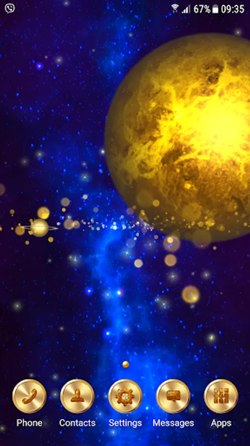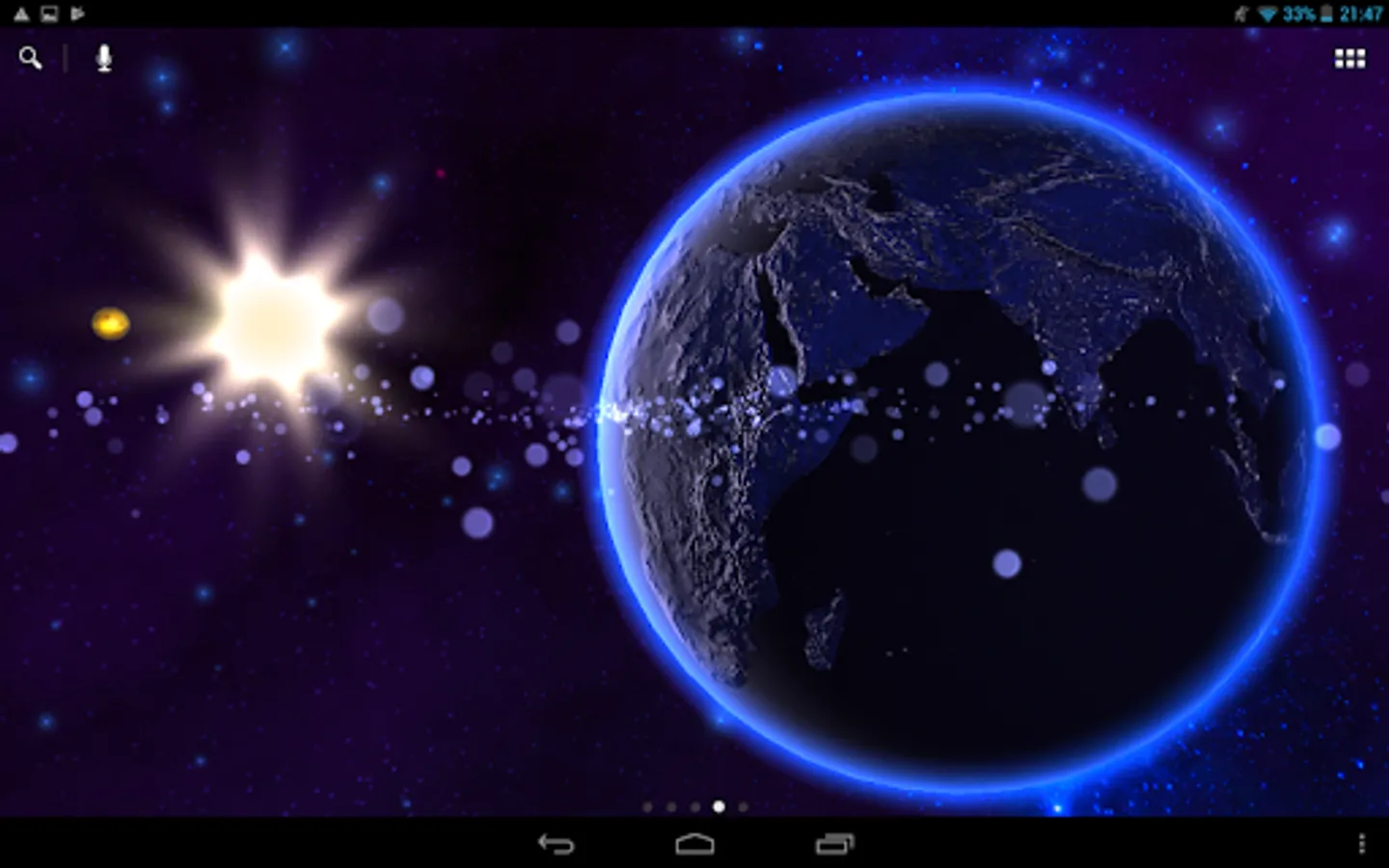 In this wallpaper, we can see an alternative version of our Solar system. There is no Milky Way or known constellations. Instead of their beautiful nebulas and thousands of bright stars on a night sky. And only big celestial bodies present in this live wallpaper - Sun and nine planets (Mercury, Venus, Earth, Mars, Jupiter, Saturn, Uranus, Neptune, Pluto). Earth and Mars's planets look more like our real planets and other planets are look less similar. Jupiter looks brighter than its real prototype and color palette a little different. Real Venus planet completely covered by clouds but in this alternative version, we can see surface through the clouds. Saturn, Uranus, and Neptune also look brighter than the real planets and color palette different.