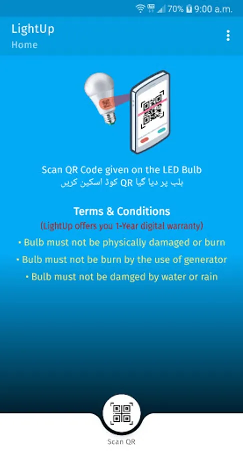 Click on the 'Scan QR' button on the Home screen and scan the Qr code given on your LightUp LED bulb.