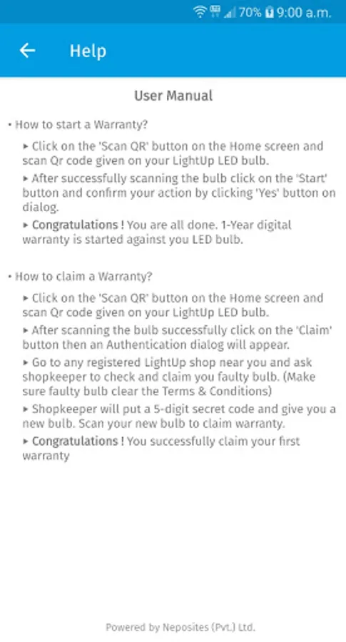 • Shopkeeper will put a 5-digit secret code and give you a new bulb. Scan your new bulb to claim a warranty. Congratulations! You successfully claim your first warranty