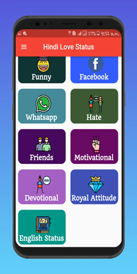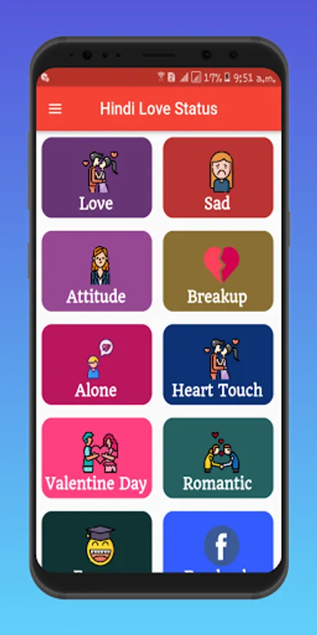 This app gives you the best Hindi Love Status 2020 हिंदी प्यार मोहब्बत शायरी. Show your attitude & personality with these attitude Status in Hindi or Hindi sad Status or true love Status or Dosti Status or Hindi funny Status and many more from our collection of best Status in Hindi. Collection of Hindi Love Status 2020 हिंदी प्यार मोहब्बत शायरी which can be used as a WhatsApp status, Facebook status, Instagram captions or on any other social media. Presenting your best Status 2020.