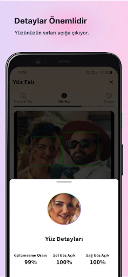 Your face hides a lot of information about you. You can do character analysis by looking at people's faces and have an idea about their future. If you're tired of paying high fees and getting your fortune-telling done, give Calypso a chance. Get the most accurate information about you with fortune telling based on real photos. With its high-level face identification system, Calypso does not use your fortune telling when it cannot identify your face.