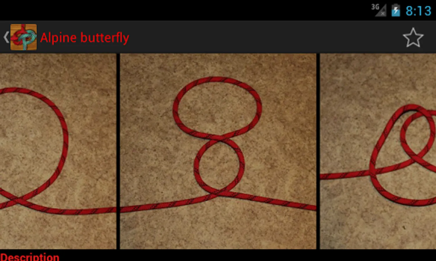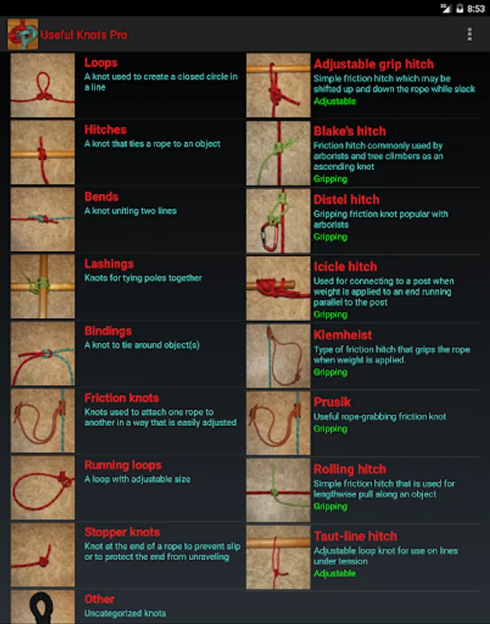 Knots are categorized by type and each knot has a description and step by step instructions with pictures and guide on how to tie it.