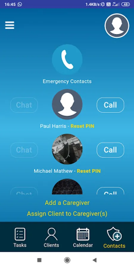 o Client can communicate via secure chat inside the app to any of his or her caregivers