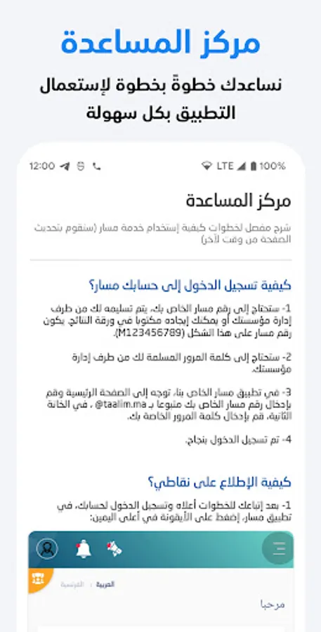 - التطبيق غير تابع لأي جهة حكومية، تم تطويره بشكل مستقل من طرف مطور تطبيقات لمساعدة التلاميذ وأولياء الأمور على الولوج إلى كل ما يخص التلاميذ من نقاط وغياب. نعم أعلم أنه هاته الخدمة موجودة سابقا، لكن تم تصميم هذا التطبيق لحل جميع مشاكل خدمة مسار الحالية.