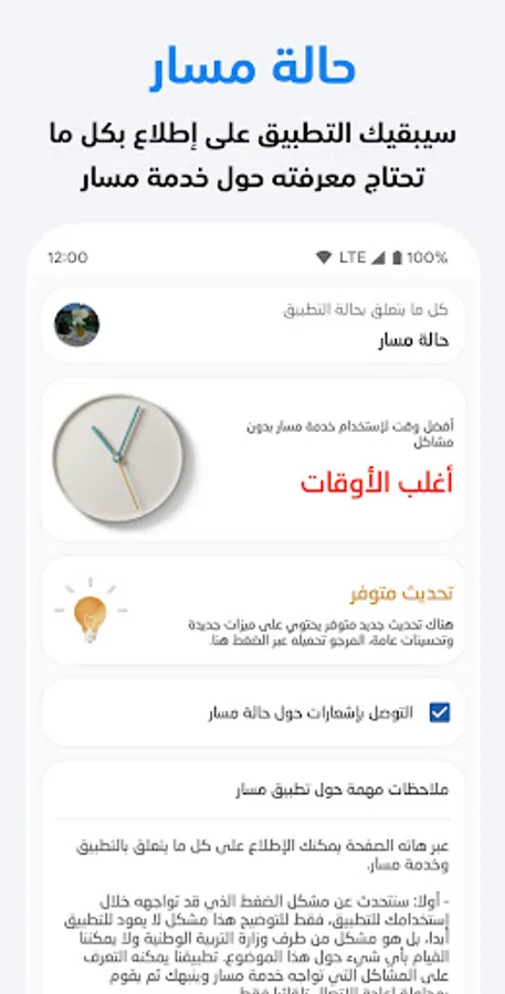 يتوفر التطبيق على نظام خاص لإخطارك عندما تكون خدمة مسار تحت الصيانة أو متوقفة بسبب الضغط لكي تكون على دراية بكل ما يحدث حول للخدمة.