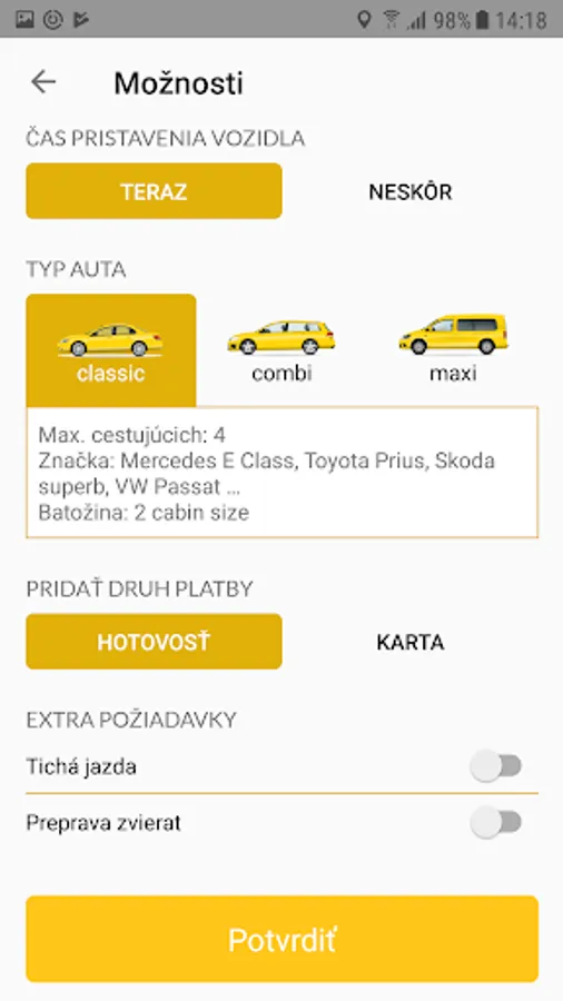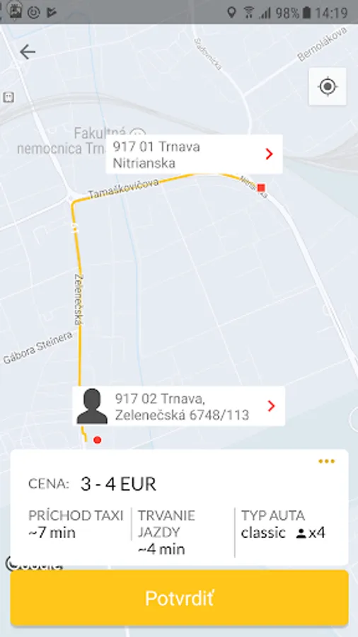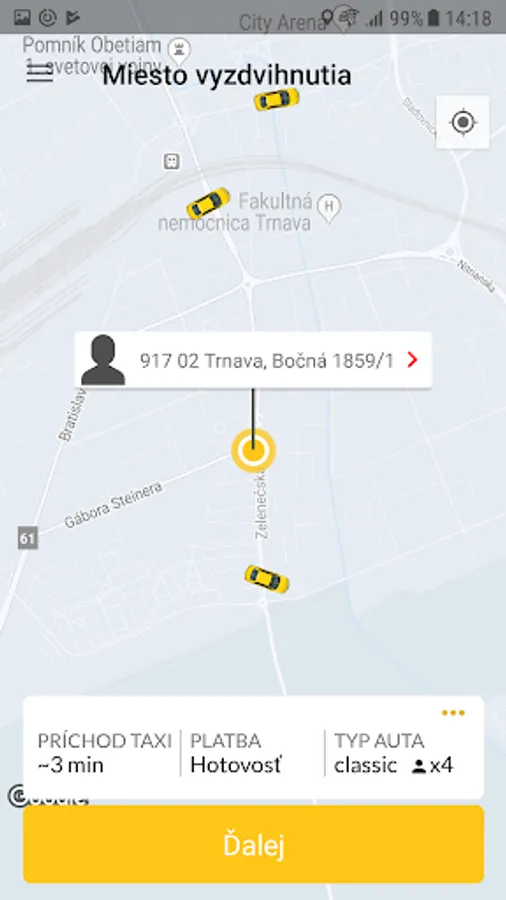 - Pasažier dostane Upozornenie 3 minúty pred príchodom taxíku the hneď aj na po príchode miesto