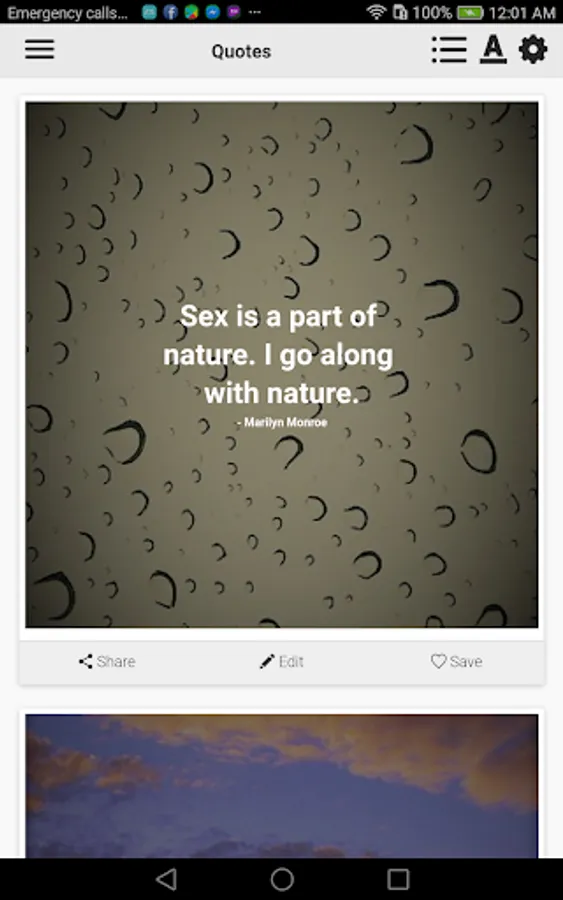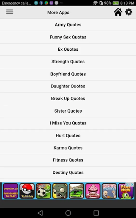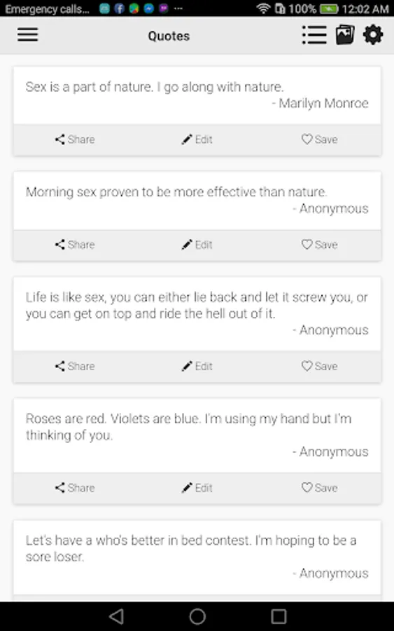 This is an App that stores many quotes about sex. I will continue adding new messages timely. So in the future this will be great database of all sex & relationship quotes for every couple. You can send these quotes to your girl or your boy. There are many great and funny quotes about sex that you will enjoy.