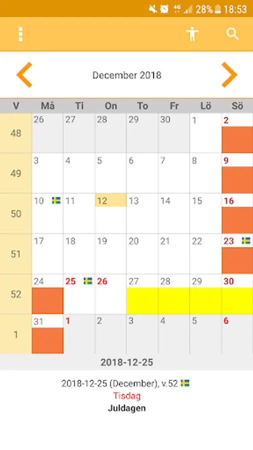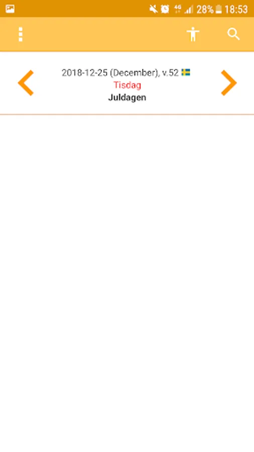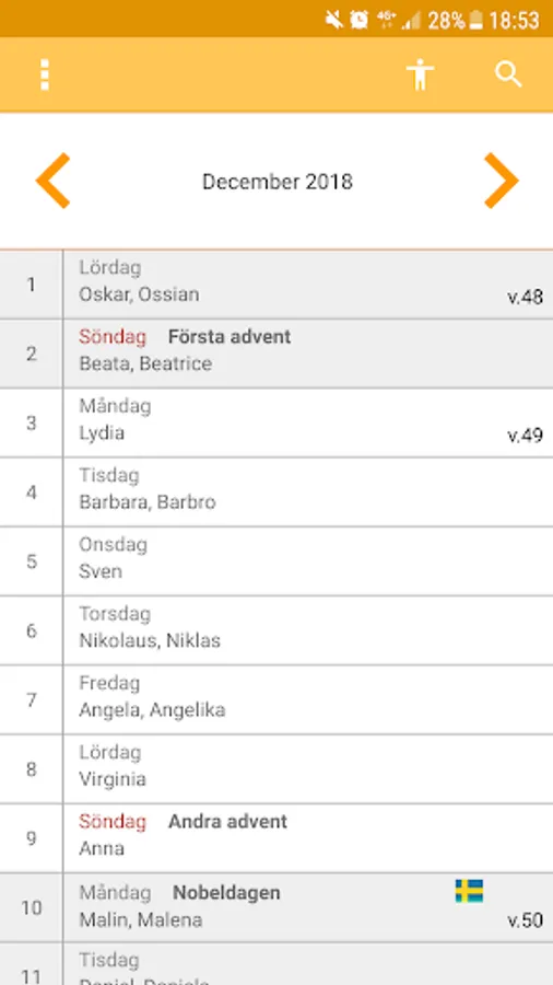 This is a Swedish calendar which is very easy. It shows red days, flag days and other special days. The calendar also shows who has name day. It is possible to get a notification every day that contains information about the day itself. You can not add events in the app.
