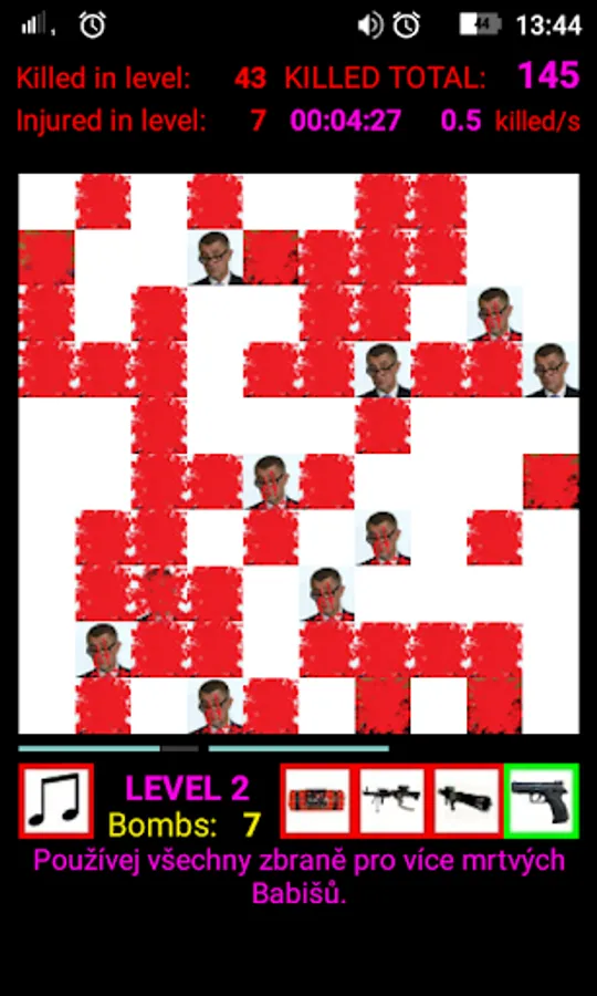 The game contains 10 levels. To advance to a new level, it is necessary to destroy at least 100 Babis and fill the battlefield with destroyed Babis.