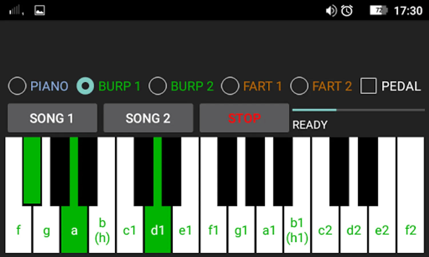 The piano has 5 sounds: PIANO, BURP1, BURP2, FART1, FART2.