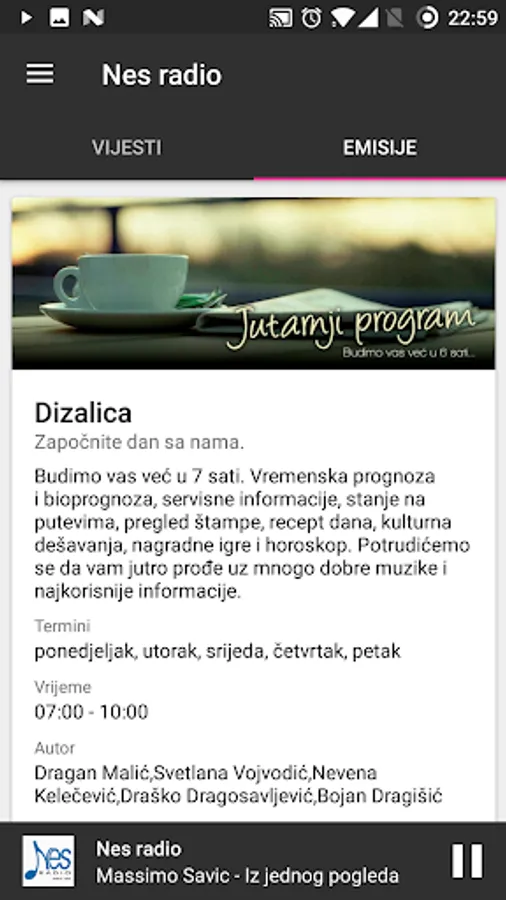 Apart from quality music, Nes radio offers objective information to its listeners concerning domestic but also regional and world news. According to relevant local and international research, Nes radio is among three the most popular radio stations in BiH.