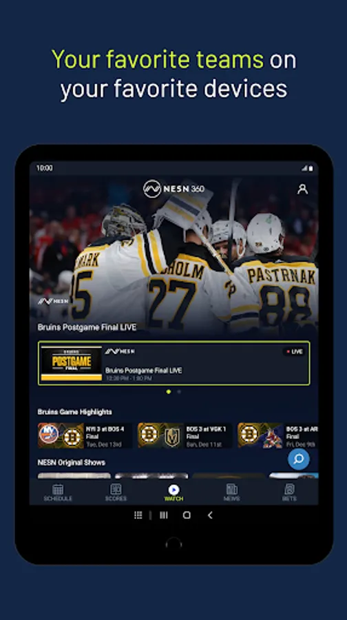 Upgrade your New England sports streaming experience by downloading the app and accessing NESN’s premium content on your favorite device. NESN’s premium content is available with a participating TV provider or directly. Download the NESN 360 app to start watching.