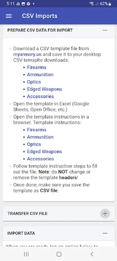 Importing your firearm information has never been easier. Whether you prefer to use your computer or already have data in a CSV file, we've got you covered. Simply download the CSV template from myarmory.us, fill it out on your desktop computer, and transfer the file to your mobile device using Dropbox, Google Drive, iCloud, or any other file-sharing tool. Once your data is transferred, simply open the My Armory app and import the data. No need to worry about manual data entry or starting from scratch. With the greatest gun app, you'll have all your firearm data in one place, accessible from anywhere at any time.