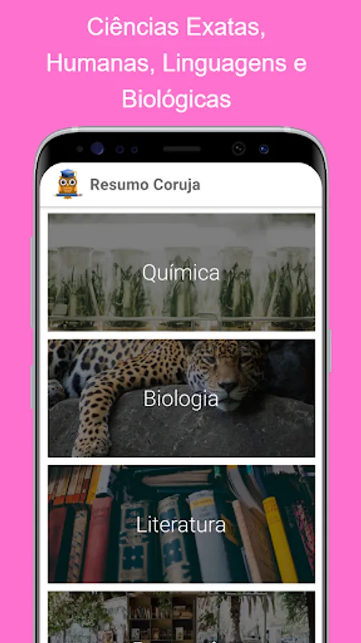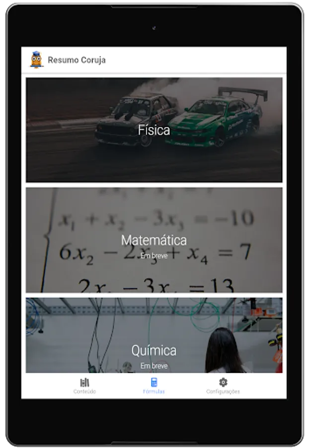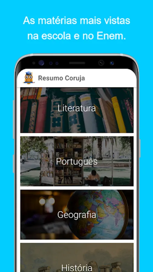 Abstract Coruja is a pocket application with summaries of the main contents of school, high school and Enem. The app features full summaries of math, physics, chemistry, biology, geography, and history, and the content is updated monthly.