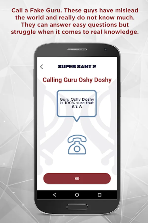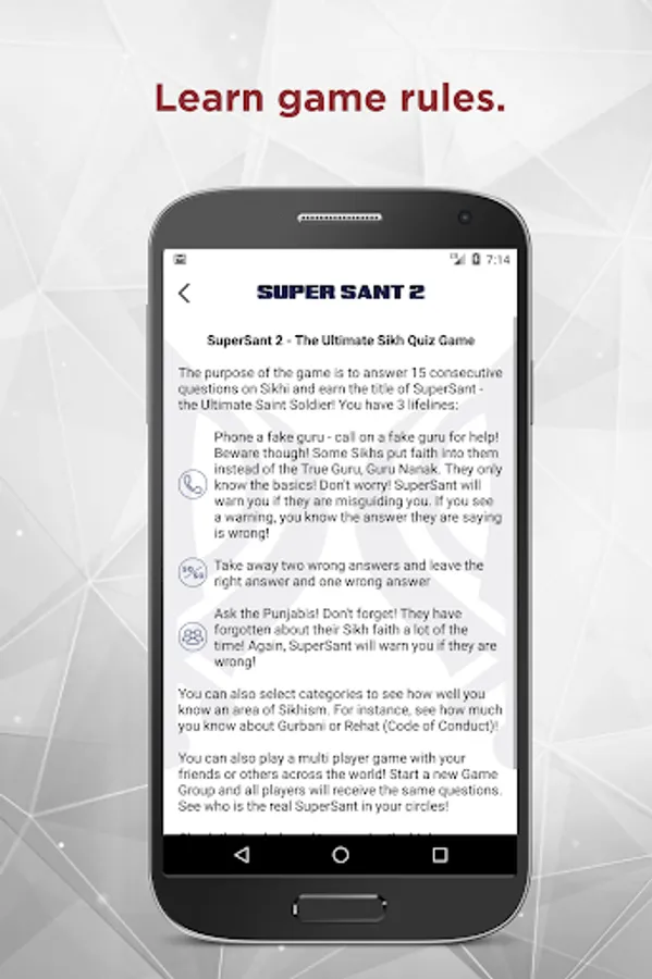 SuperSant it a quiz game where you answer 15 questions to become a SuperSant - the Ultimate Saint Soldier. Questions get harder and harder and you have three lifelines that you can use to help. Remove two wrong answers with a 50:50. Call a fake guru and see if they can help (they usually can't, but SuperSant will help you through the game and warn you when you are being misled). Or ask the Punjabis - be careful though, they only know the basics. The quicker you answer a question, the more bonus points you get. Try and get on the Leader-board. Also challenge your friends or the world by creating game groups! The game also records your stats so you can see how you have progressed historically.