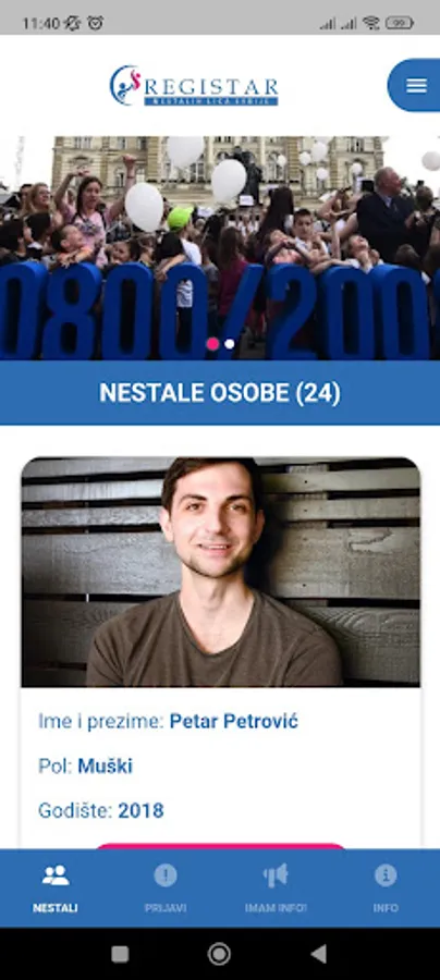 Registar nestalih lica Srbije omogućava brzu i laku prijavu i pretragu nestalih lica unutar granica Srbije. Osim registracije i pretrage nestalih, aplikacija građanima daje mogućnost za dostavljanje informacija o nestalim licima, ukoliko o njima imaju određena saznanja.