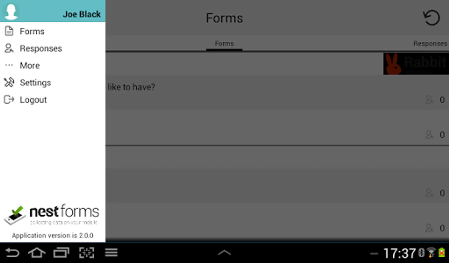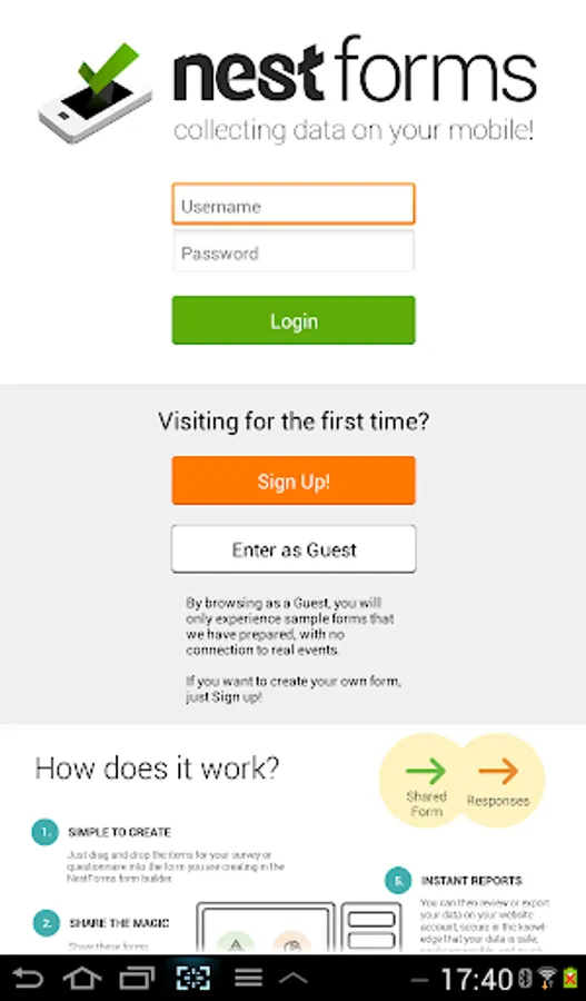 Try the app within the free demo account, where you can view the app interface and make several test responses. If you would like to try it out with your own surveys, you can register your own account on https://www.nestforms.com and create your own forms via the website, that will then link to your app seamlessly.