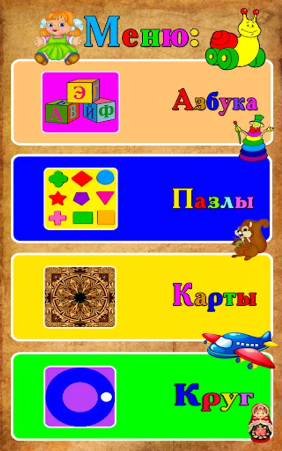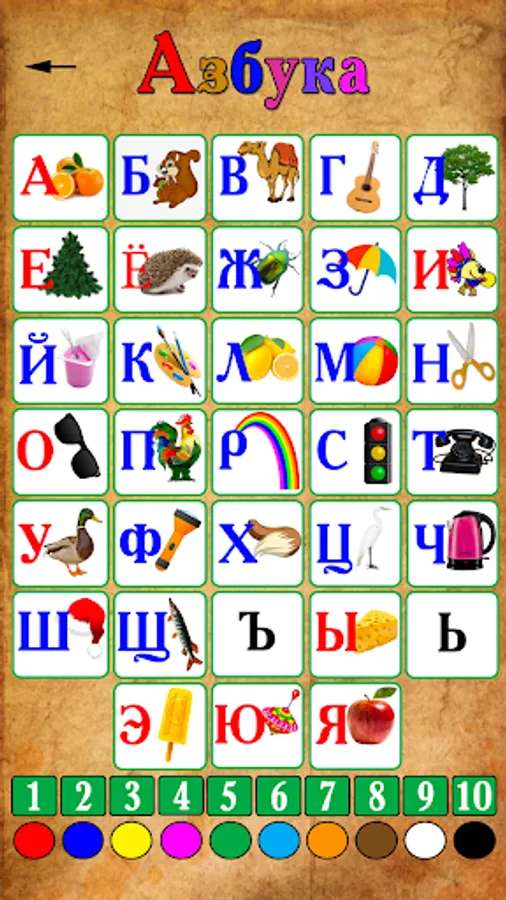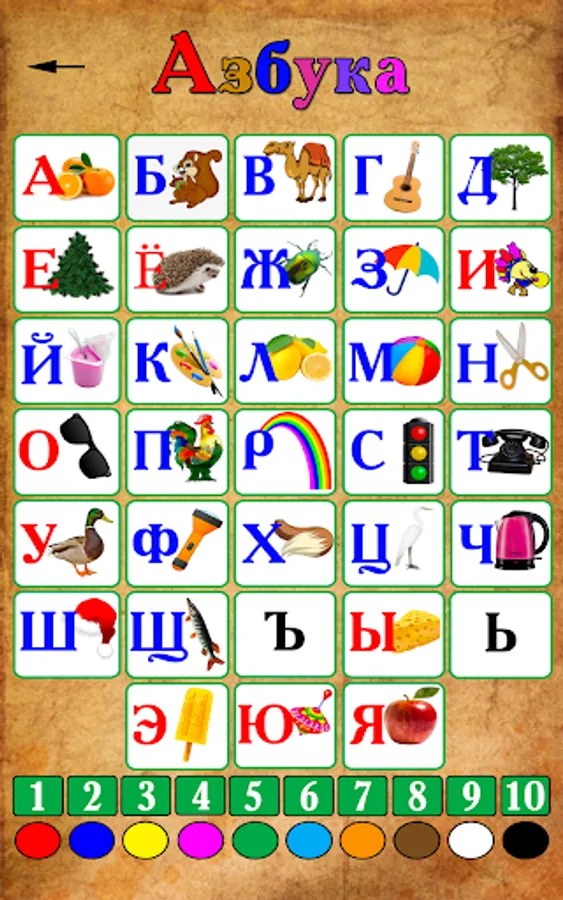 1. Alphabet - by pressing the letters, numbers or color buttons, the sound is heard;