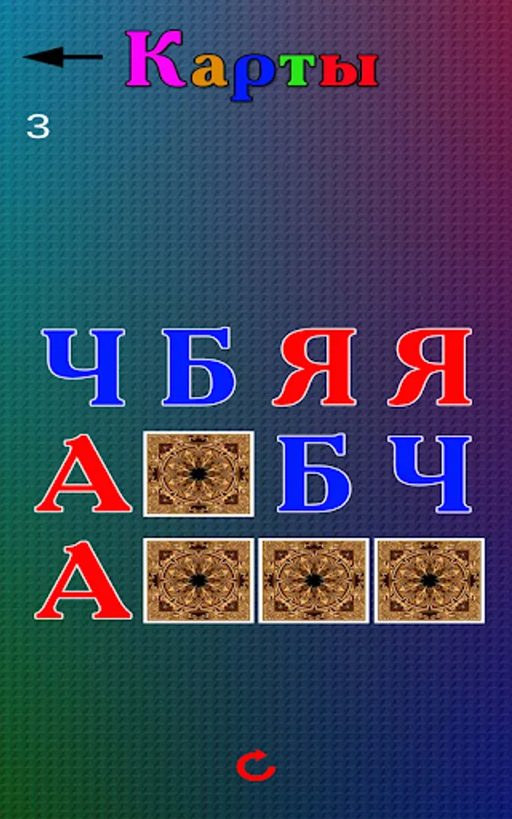3. Cards - you need to find the same letters. It is allowed to open no more than two cards. If the open two cards match, then they remain open, and if they do not match, then the cards are automatically closed. Develops the child's memory and improves the memorization of letters.