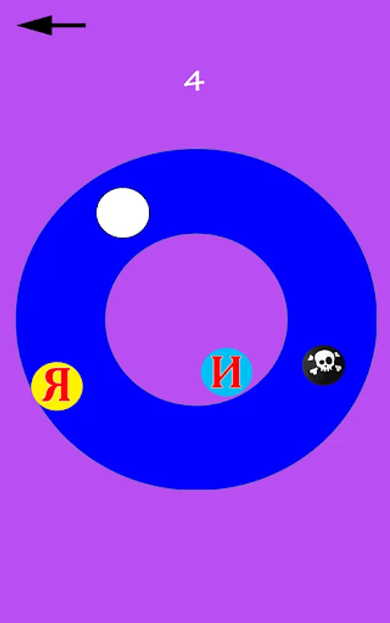 4. Circle - the ball is spinning in a circle. Touching the screen changes the direction of rotation. You need to catch the flying letters with a ball while avoiding the bombs. By sticking a ball of a letter, the sounding of the caught letter goes.