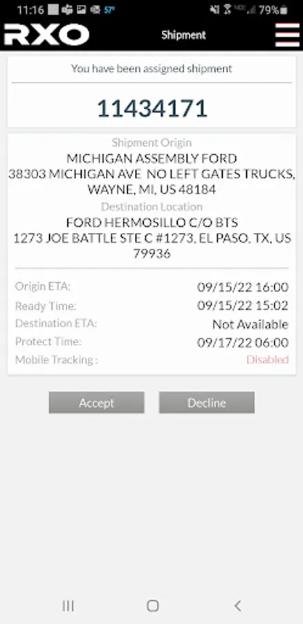 RXO, Inc. has created an application for drivers that sends GPS updates directly back to the Managed Transportation Expedite platform. No more online check calls to provide location updates! Once a driver is on a load, GPS updates are sent back to RXO every 15 minutes automatically. Driver has a quick view of location information, and pick-up and delivery times as well.