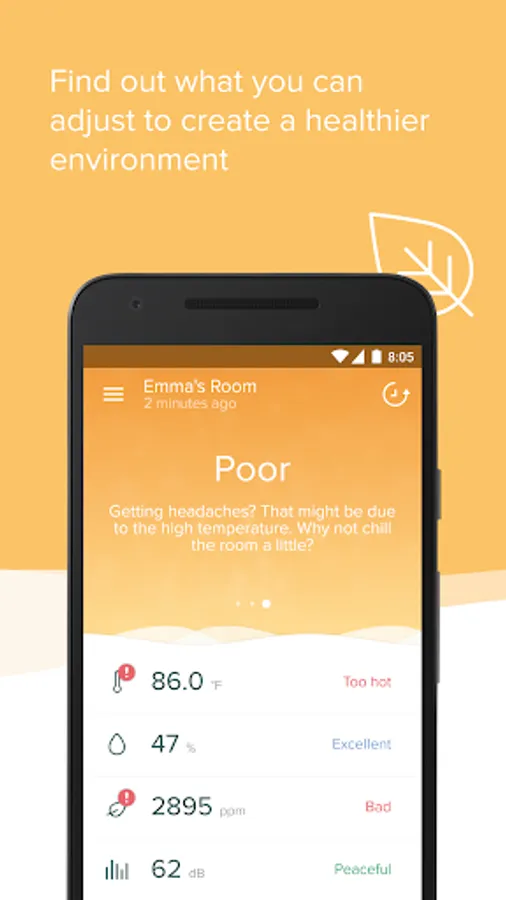 • Alert icons help you identify which parameter needs to be fixed: humidity, air quality, noise or temperature.