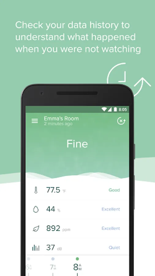 • The App‘s color-coded background makes it easy to see how healthy the room where you put your Healthy Home Coach is.