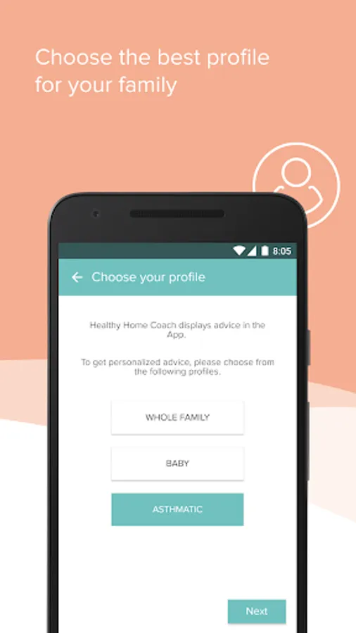 • You can choose between 3 different profiles according to your specific needs: baby or toddler/someone with asthma and allergies/whole family