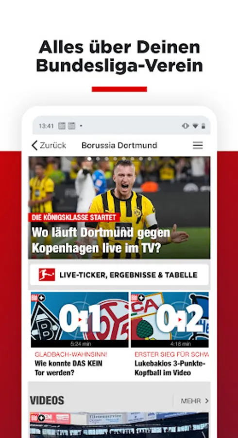- The latest sports live ticker: Your club from the Bundesliga is playing and you won't miss any news updates. If a goal is scored, you will be informed immediately by push message. In addition, the "My Club" widget on your app start page with all the important current news about your club!
