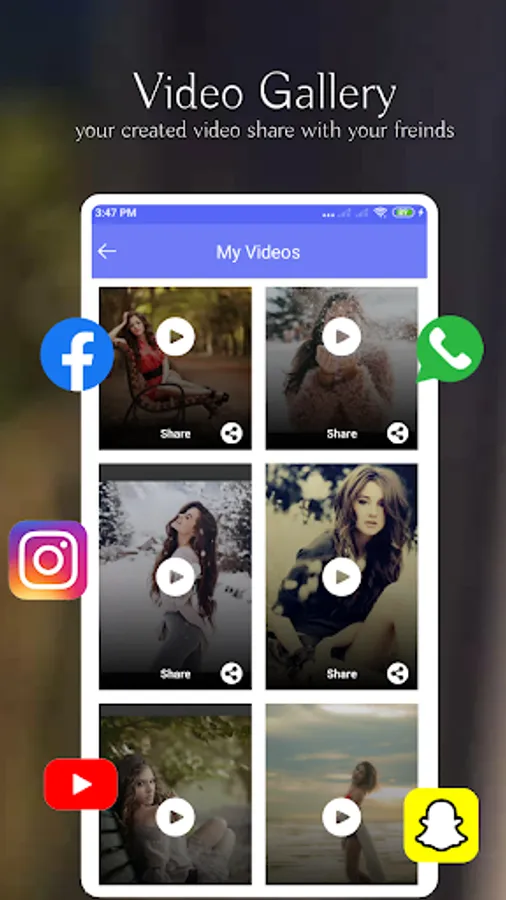 * Music: The app provides melodies that match every video theme. You can also add your favorite songs and music tracks from the device to make your videos interesting and engaging.