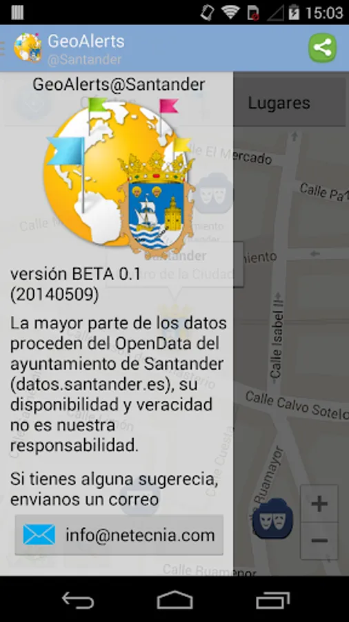 Most of the information comes from the municipality of Santander OpenData (http://datos.santander.es/). GeoAlerts @ Santander is not responsible for the accuracy of the contents, or its availability or format. Any change in the OpenData could cause certain sections of the application are not operating properly. If you look at something do not hesitate to communicate.