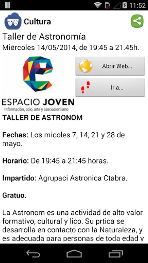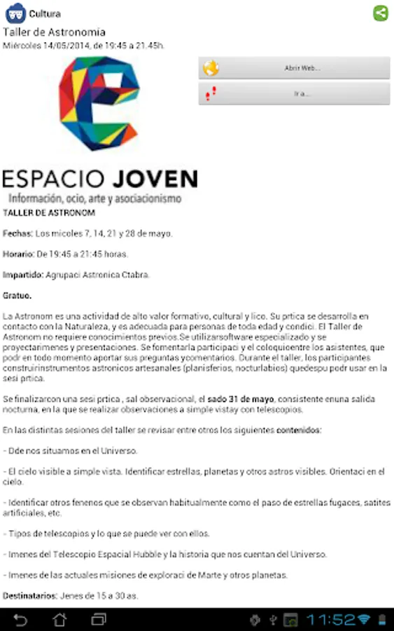 Application to be informed of the cultural events and shopping deals in town of Santander. Also includes other useful information such as parking spaces for disabled or PMRs, taxi and bus, hotels, etc ...