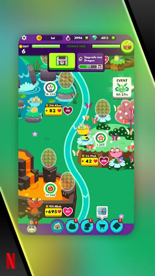 Expand your idle kingdom by unlocking more lands and exotic habitats. Upgrade your dragons and nests, and they'll produce more coins. Collect cards and magic potions, then level up your favorite dragons to increase their abilities.