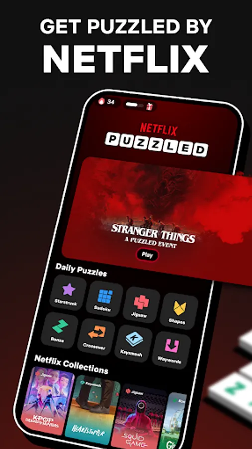 Keep your mind sharp with special puzzle collections that weave in the magic of Netflix series and films, from "KPop Demon Hunters," to "Squid Game" and "Stranger Things." Find new puzzles every day in the app or at Tudum.com, and get started on a legendary solving streak.